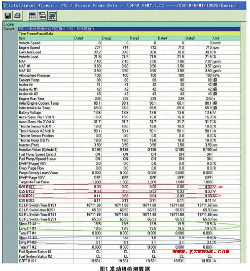 该故障检测的B1S1空燃比传感器电路响应慢,进行定个数据检查(图1)发现其电压值一直为0,则ECM判定左侧气缸空燃比稀,需要增大喷油量。