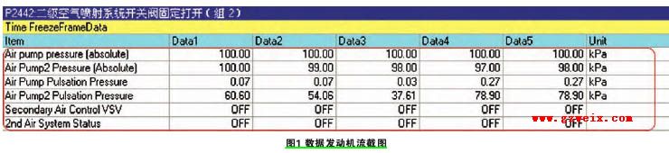 车辆入场,确认故障现象,发现三个故障指示灯(发动机、4LO和VSC)同时点亮,采用电脑检测仪IT-Ⅱ进行检测,测得故障码为P2442二级空气喷射系统开关阀固定打开(组2),截取发动机数据流如图1所示: