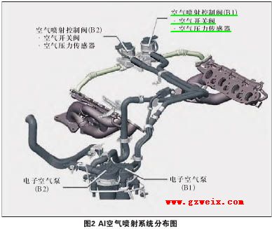 AI(空气喷射)控制系统是使用电动空气泵强制把空气压入。该系统是由发动机ECU所控制,只有在当发动机冷机状态和车辆减速而使HC和CO废气排放增大时,该系统进行运作。当所有的运行条件存在时,发动机ECU启动电动空气泵的同时VSV系统也工作,以使进气歧管真空流入空气喷射阀,这样就打开了压缩空气流入排气歧管的通道,ECU依据空气流量计传来的参数,评估流入TWC的喷射气空的总量。