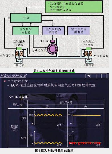 图3中是二次空气喷射系统的组成,由空气喷射控制器、空气泵、空气压力传感器、开关阀、继电器、加人气、ECM等组成。