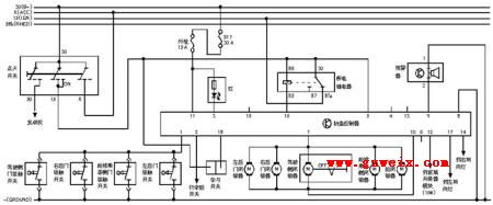 接车后首先确认车辆的故障现象确如用户所述。导致此故障的可能原因包括中控锁开关故障、相关线路存在短路现象以及车身控制单元BCM内部故障。使用故障诊断仪X431检查,车身控制单元BCM中无故障码存储,使用故障诊断仪的执行元件功能进行动作测试,在动作测试时中控锁可以正常开锁和闭锁。如果使用遥控器进行开锁,则门锁不会出现自动落锁的故障,这说明故障点不在于遥控系统而在于中控系统。笔者根据原厂电路图手绘了中控锁线路连接示意图(附图),进一步检查中控锁的开、闭锁信号线,发现中控闭锁信号线(左前门扶手中控开关插接器2号脚)存在一直对地导通的现象,该线经左前门线束中插接器A的A15脚(室内线束与左前门线束插接器)后去往BCM的PE4/A5针脚。试着断开左前门线束插接器A后,中控闭锁信号线对地短路现象消失,这说明故障范围在BCM的PE4/A5针脚到插接器A之间。连接上插接器A,再断开BCM的PE4插接器,发现短路现象消失,于是笔者分析认为是BCM内部故障,但更换BCM后故障仍然存在。
