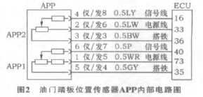 油门踏板位置传感器APP位于驾驶员仪表板下方,油门踏板上方, 如图1所示。 其内部有2个相同的电位计式传感器,向ECU提供驾驶者的驾驶需求信号,这个过程在操作上与目前机械式的踏板完全相 同,以适应驾驶者多年的驾驶习惯。 2个相同的传感 器分别向ECU提供油门信号 , 从而保证了此系统更安全、更可靠。