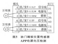 拔下油门踏板位置传感器APP插头, 把数字万用表打到电压档,两表笔分别接传感器插头的2#与3#针脚、 1#与5#针脚。 传感器电源电压检测如图3所示。 接通点火开关, 正常情况应为5 V, 若无5 V电压, 应检查发动机控制单元至油门踏板位置传感器之间的导线是否短路或断路。