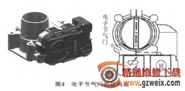 电子节气门由节气门体、 驱动电机和节气门位置传感器等构成。 节气门位置传感器位于电子节气门上, 如图4所示。 电子节气门用于驱动节气门转