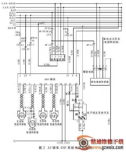传感器内部2个电位计式的传感器采用了独立的电源和独立的搭铁线。传感器内部电路图如图2所示。采用这种独立供电和独立搭铁线的结构可以保证系统