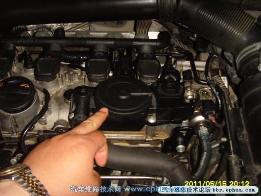 一辆一汽迈腾TSI发动机在热车时有哨叫声,声音有点象皮带打滑,4S店检查也没发现问题,当时我也怀疑是组合皮带发出的声音,因为声音好象发生位置就在曲轴皮带盘,但拆下组合皮带声音还是有而且声音大小没变化,皮带问题排除(提醒:这个车千万不能拆曲轴皮带盘,拆下后再装就比较麻烦的)有声音时发动机工作还不好有抖动,又怀疑涡轮增压器发出的声音,后来查资料知道涡轮增压在怠速时不工作,涡轮增压器问题排除,经检查发现故障是发动机上方油气分离器坏了,有漏气现象,更换后故障现象没有了。