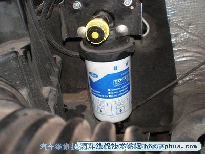 今天来了一辆福特全顺保养.机油机滤.空滤顺利完工.柴油滤怎么换?仔细看新滤清器.上面画2把锁.一把为开启状态.一把为锁闭状态.并且滤清器座上对应也有2把锁标记.手托住滤清器逆时转动.直到滤清器上开锁标记对上滤清器座上开锁标记.左右轻摇取下.装时最好给其加满柴油.其上有一黄色手动排气装置.装好滤清器后压动排气装置.制导装置内无气泡.柴油满方可启动.