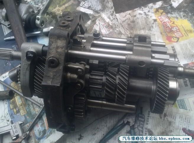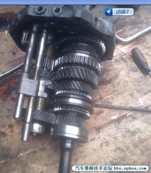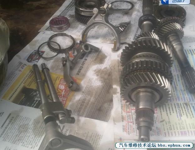 今天来了辆金旅面包车,车主说挂三档就有异响,车就上了四柱举升机,没有试车来判断,因为当时还有一个车进厂里GL8缸垫渗水,等确定了GL8车要修的过程等后接到金旅,决定先抬下来再说 把变速箱解体后发现三档副轴齿已经断了两吃 老板就去买配件了咯