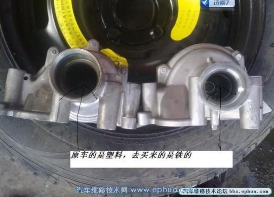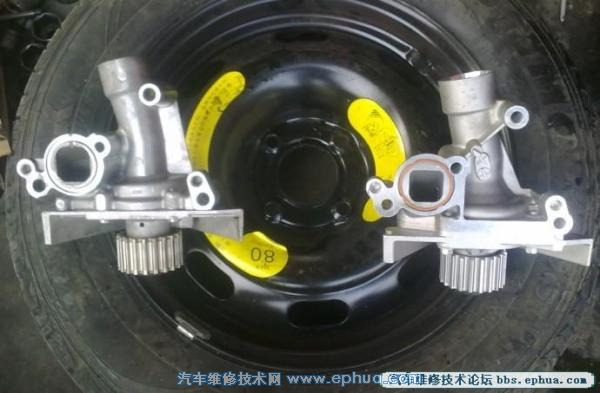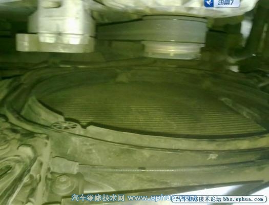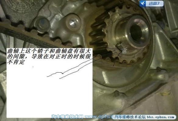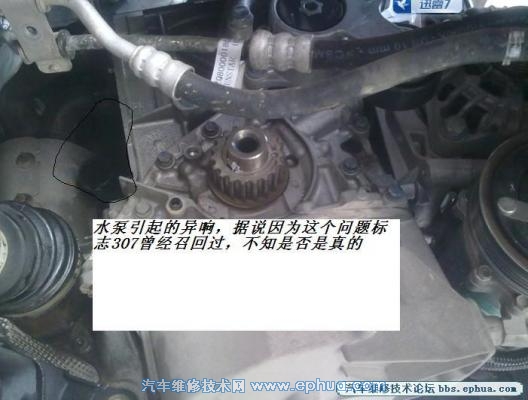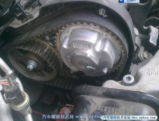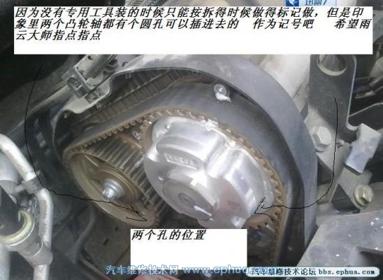 车是开过来保养的,上了四柱举升机后听到有异响,刚开始以为是张紧轮的声音,后来换好机油把车开出来,把张紧轮松了取出皮带再打发动,声音仍然有,而且是发动后最明显,然后加速声音就没有了,后来用听诊器听,初步确定是在水泵位置,决定拆开再说,拆开后居然没有看到正时皮带的标记,我只是记得在两个凸轮轴盘上有个小孔可以做正时标记,哎没资料没工具呀