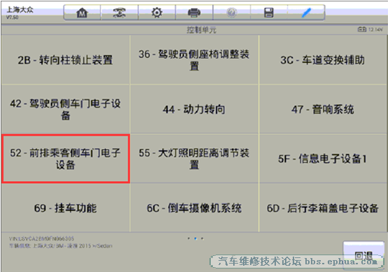 操作步骤: 1. 连接道通908,选择正确的车型 2. 进入诊断,选择“控制单元” 3. 进入“52-前排乘客侧车门电子设备”