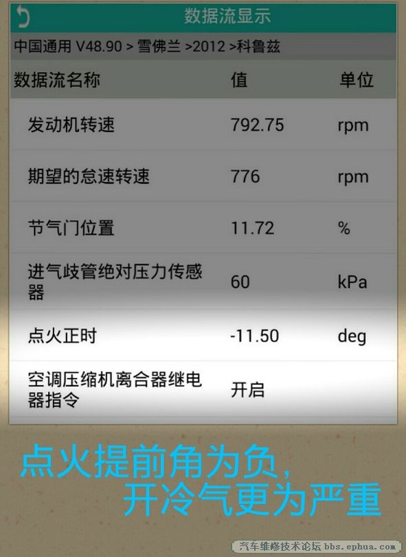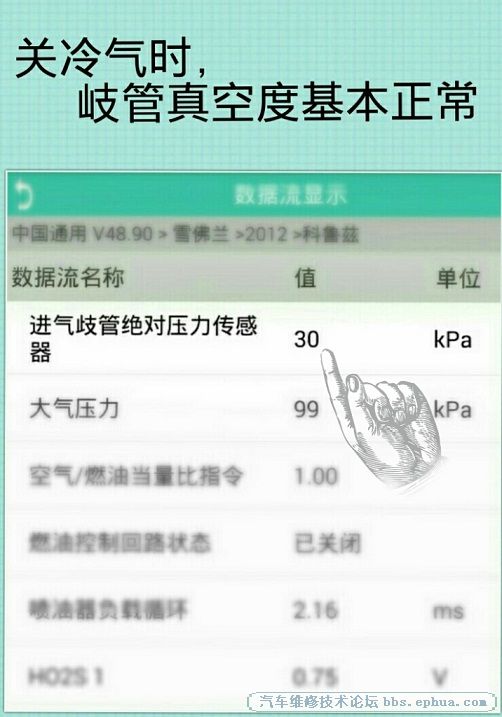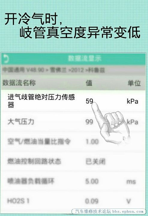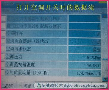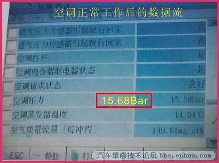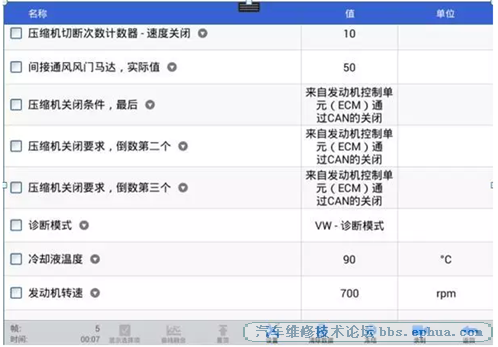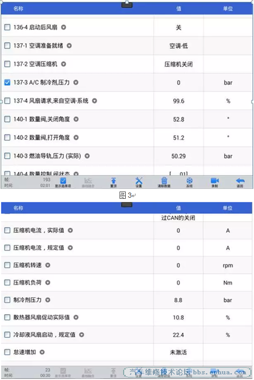 图2 发动机电脑为什么会不允许压缩机开启呢?我们进入发动机系统,读取数据流,查看相关数据项,发现发动机系统中读取到的A/C制冷剂压力为0bar(如下图3),而空调系统中读取到的制冷剂压力为8.8bar(如下图4);数据不一致。