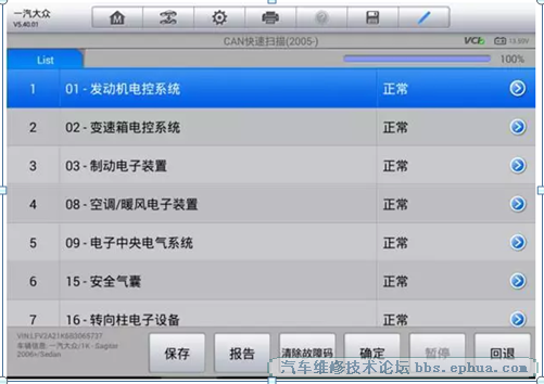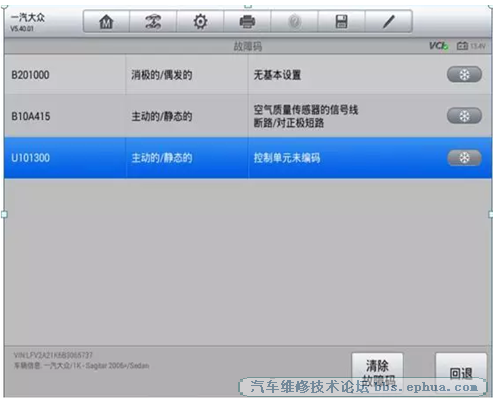 通过对比分析以上两个数据流,我们将问题锁定在,空调控制面板发动机ECU以及两者之间相互通讯的问题。 查询电路图,发动机系统通过CAN总线,从空调控制单元获取相关数据。因空调系统中可以读取到正常的发动机转速(如上图2)700转,说明中间的通讯没有问题,可以排除CAN总线数据传输问题。那么可能存在的问题锁定在“空调控制面板”或“发动机电脑板”上。 因发动机工作一切正常,我们把重点放在了“空调面板上”更换一块新的空调面板,更换后,A/C开关不工作,空调不工作,存在多个故障码(如下图5)。