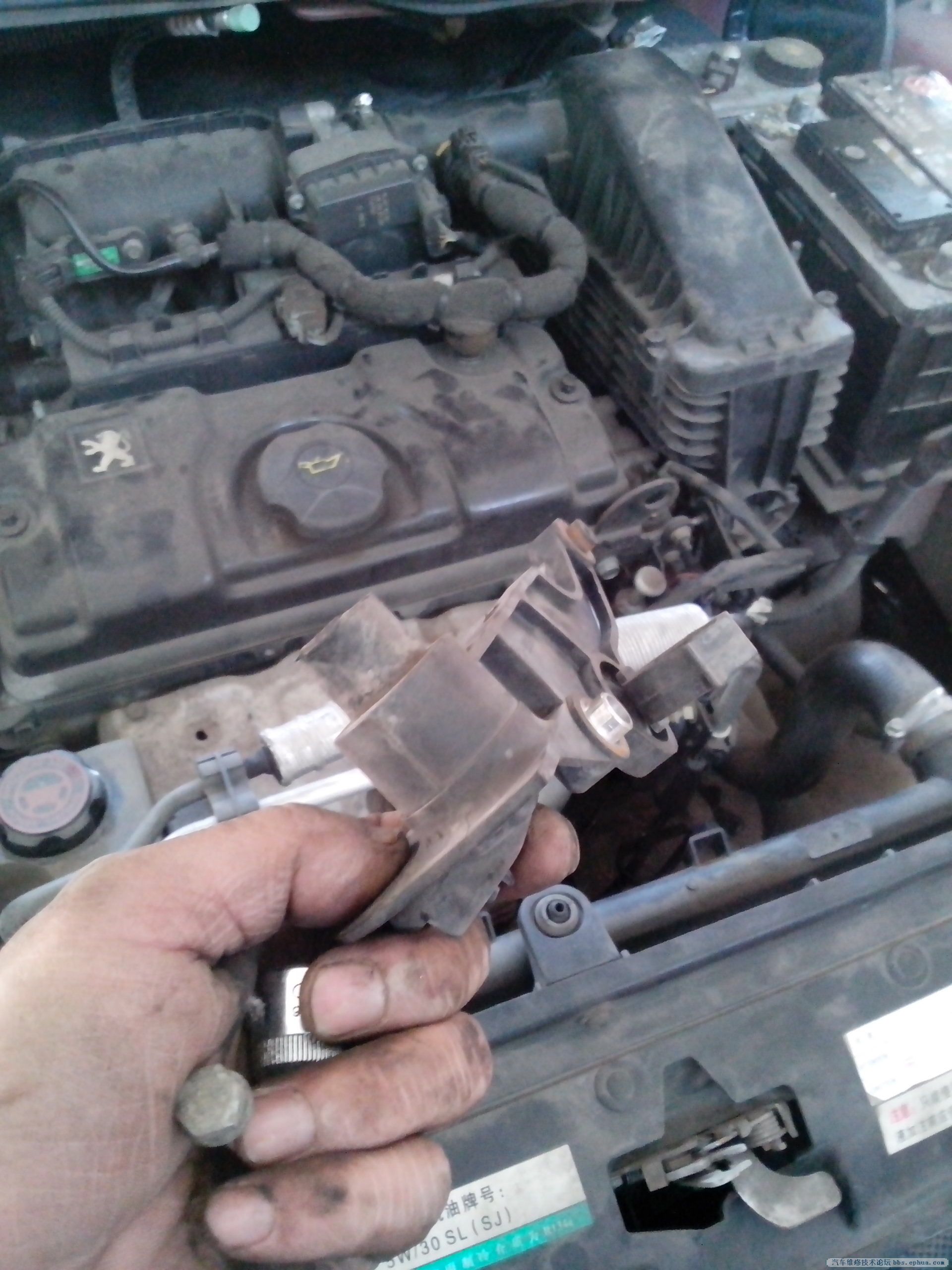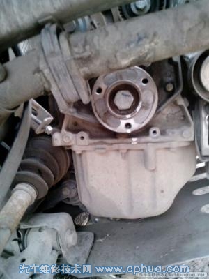 劳动节期间来我们这玩的车比较多,外地车,此车在坡上倒车掉头时不着火了,车主以为没油了,自己打的油还是不着车,经路边人打听到我这的修理厂,我厂人去检修的,拖回来后说是油泵不工作,我用试灯量下火线有电,看来没打铁回路啊启动时,我就喷清洗剂也不着火,我问车主怎么回事他说倒车时就熄火了,还有就是一股焦糊味,说烧片了,没油没火就好查了,我就用电脑检测有故障吗,检测无故障,读转速信号检测不到一点转速,,看来曲轴位置传感器有问题,我就拆看看,刚把传感器拿下来就听见掉个东西似的,心理明朗多了,上图