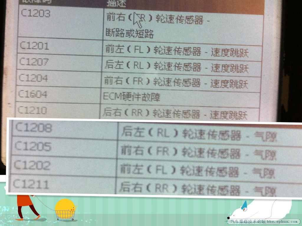 回到厂里,ABS灯再次点亮,读取故障码为上图的C1208,C1205,C1202,C1211。同样能清除。