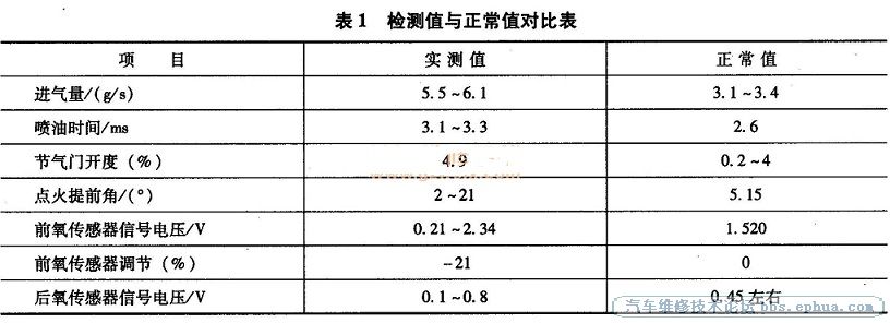 对以上数据分析得出如下结论:空气流量传感器信号不正确;节气门开度大,需要清洗;点火提前角变化过大,按经验需要更换火花塞;根据前氧传感器的信号及调节情况,可以判定发动机混合气过浓:后氧传感器的信号变化过大,会损坏三元催化器,在正常无负荷状态下,后氧传感器不参与工作,其信号电压保持在0.4~0. 5V左右。对该车进行检测的实测值与正常值对比表如表1所示。