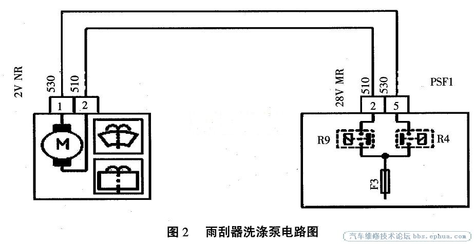 故障排除:为了判定故障是否彻底排除,试车50km后,车辆的行驶无异常。然而,再次断开保险盒上28V/MR及28 V/GR插接器时,发现还是有少量水迹。这里边的水迹检查时已经吹干了怎么还会有水呢?是洗车时或下雨时水渗入到线路中了?还是雨刮器喷嘴滴下来的水?为了搞清这2个插接器与哪个部件有关,先调取雨刮器洗涤泵电路图(见图2示)。从电路图中可以看出:车上与水有关的只有水温传感器和前风挡玻璃雨刮器洗涤泵,接下来分别检查这2线路的插接器,水温传感器的线路插接器无水迹,但雨刮器洗涤泵的线路插接器中都是水,那雨刮器洗涤泵的水又怎么与汽油泵线路扯上了关系?