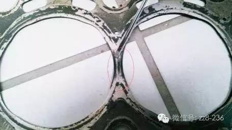 更换完后,客户表示将车子放在公司几天让我们试好再交车。车辆在公司的几天时间里,我们每天早上、中午、晚上都去试车,故障都没有试出来。没办法只能让客户使用观察,可是客户车开走后没几天又进厂反映,问题又出现,此时客户有点抱怨,如果再修不好要退款。所以我们又对整个系统进行排查,仍没有发现问题。紧接着对缸压进行测量,冷车和热车缸压测量下对比都在1200kPa 左右,冷热车测量误差不大。证明缸压没有问题。然后拆下气门室盖对偏心轴进行检查看是否磨损,经检查,磨损不严重,可以排除。又重新对了正时,故障依旧。最后又更换了DME控制模块、进气歧管和排查发动机线束,仍找不到问题。该检查都检查了,为什么找不到问题呢?我们咨询了多位宝马资深师傅,从中得到一个信息,早期3 系宝马缸盖会变形引起熄火,可以从这块入手。我们考虑后觉得已经没有什么好检查了,于是决定缸盖检查,拆下后发现汽缸床对冲,缸盖螺丝有3 个拧紧力矩不足,如图4 所示。